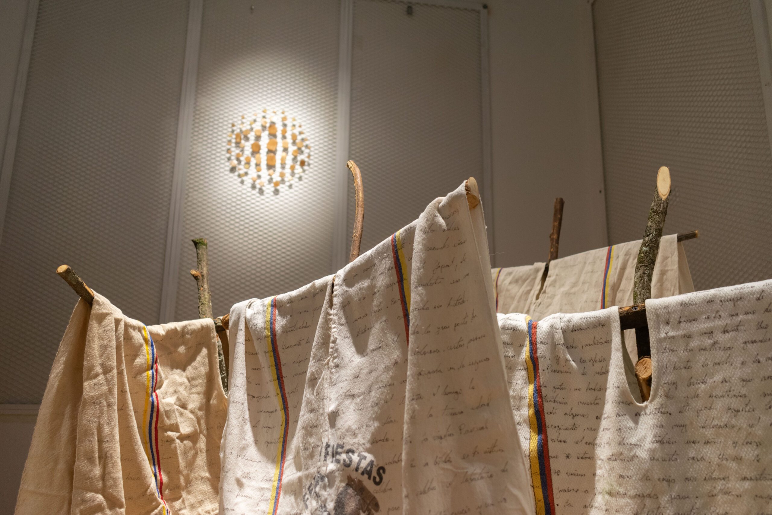 Sobre las cruces cuelgan ponchos, prenda característica de las y los labranceros que se regalan durante las ferias y fiestas del pueblo. Estos son convertidos en superficies de escritura, donde el artista plasma, casi de manera ilegible, recuerdos y relatos de feligreses recogidos en torno al viacrucis. Los ponchos, suspendidos sobre las cruces, adquieren el peso de los cuerpos ausentes y el carácter de archivo ilegible, en los cuales se inscribe una memoria colectiva y las tradiciones litúrgicas de todo un territorio.